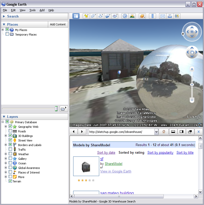 In the screenshot, the panel below is Google Earth's in-program browser with the house model that Google's 3D ninja whipped up. (Click the screenshot to see more of the Google Earth program).